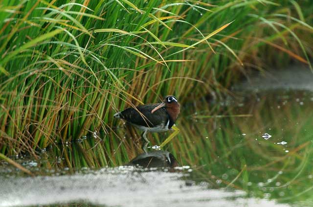 朝露に濡れる稲の下でタマシギの雌が餌を探していました。