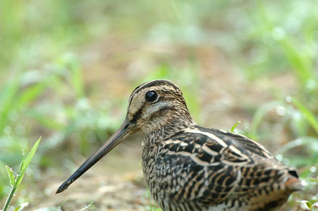 朝露に濡れた干拓地のあぜ道で出会ったジシギです。