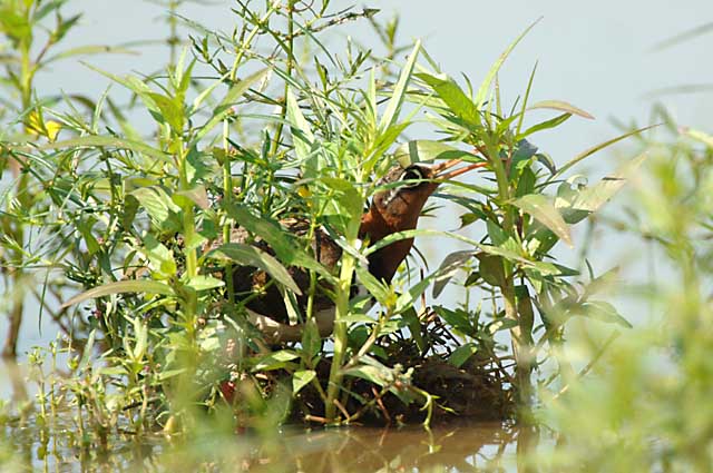 水のある休耕田のなかの少しだけ高いマツヨイグサ?の根本でタマシギのおかあさんがなにやら一所懸命です。