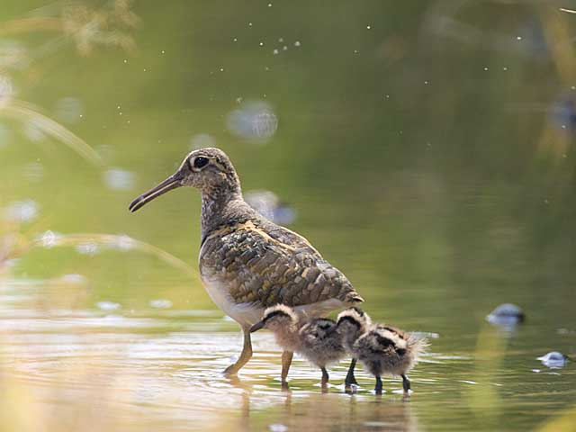 孵化したその日から巣を離れて、お父さんの後をついて歩いています。