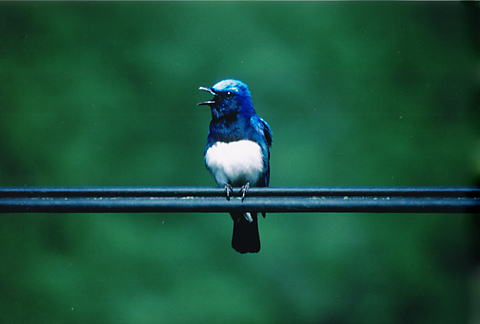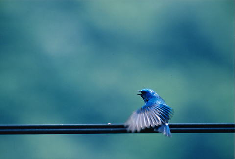 橋と平行に架かる電線にオオルリが20分に一度くらい定期的に飛んできて歌って、また谷にダイビングして去ってゆきます。
