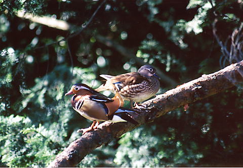 橋のすぐそばの松の木でオシドリ夫妻が休んでいました。