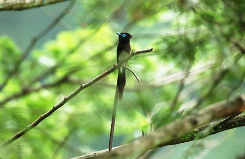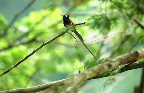 2003.06.23 サンコウチョウ♂との出会い。 昨年は春日山で何度も姿を見て、歌を聴かせてもらいながら撮影できなかったサンコウチョウでしたが、今回は京都の山の中で撮影することが出来ました。 600mmレンズでしっぽがはみ出していてうれしい悲鳴です。 |