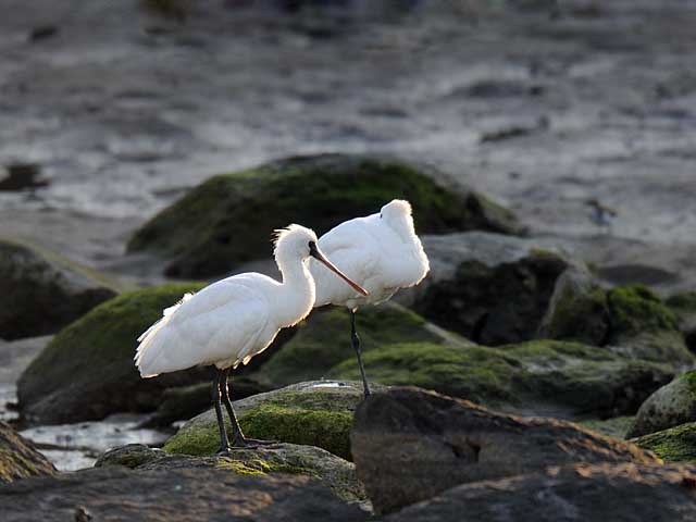 小さな河口の浜辺で越冬中のクロツラヘラサギです。