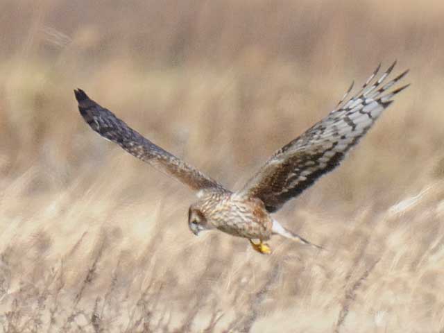 干拓地の芦原を低く飛ぶハイイロチュウヒの雌です。