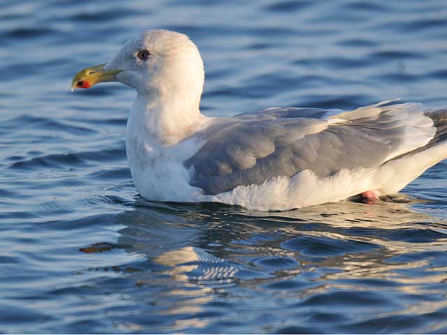 下嘴の先がオオセグロカモメよりも太く、背中の色も薄く、風切り羽根の先端が黒くなく背中の色と同じ色をしていることからワシカモメです。