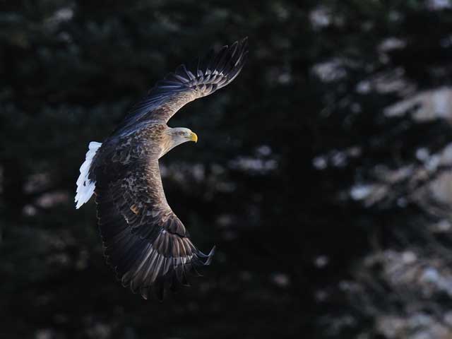 暗い林をバックにすると尾羽の白さが目立ちます。