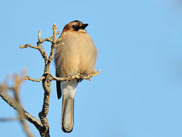 本州のカケスは頭が白く縦の黒線がありますが、北海道の亜種ミヤマカケスは頭も茶色でやはり黒い縦筋があります。