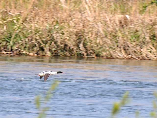 次もはるか向こう岸を飛ぶ豆粒のようなカワアイサです。