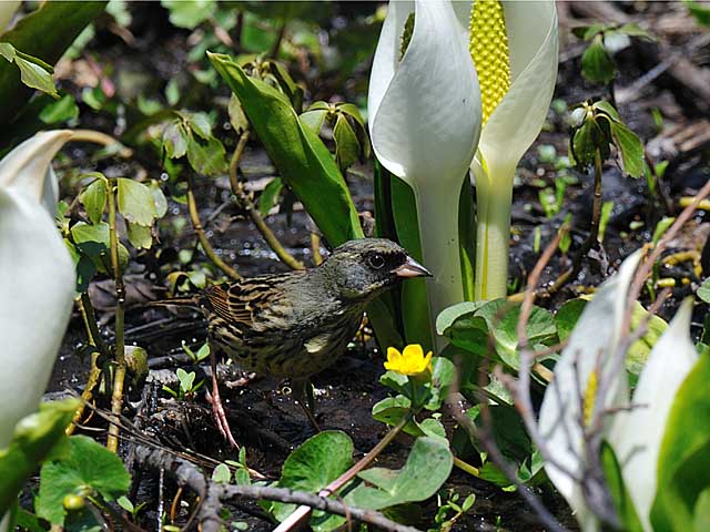 アオジもご多分にもれず、他の多くの鳥たちと同様に、ミズバショウや、リュウキンカの咲く地面にもおりて餌を探します。