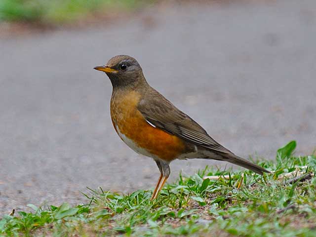 最終日の帰りに車に乗ろうとしたところに道路に出てきたアカハラで、400mmズームレンズでの手持ち撮影です。