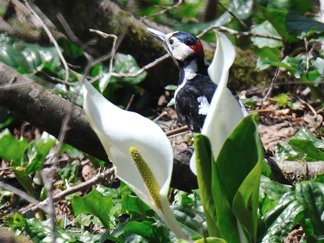 水芭蕉の咲く湿地帯に下りて餌をさがします。