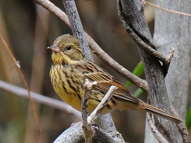 この雌は全体の色に緑色が感じられないこと、胸から脇腹にかけての黒褐色のはっきりした縦斑、腰の茶色などからアオジの雌ではなくてクロジの雌と思うのですがいかがでしょうか。