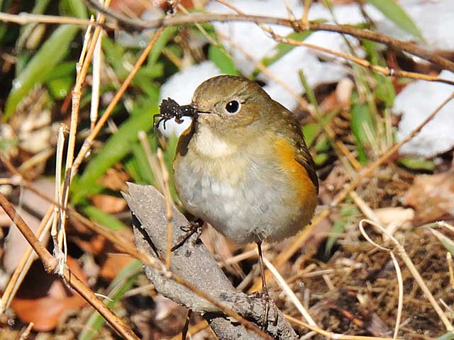 雪の里山のルリビタキ