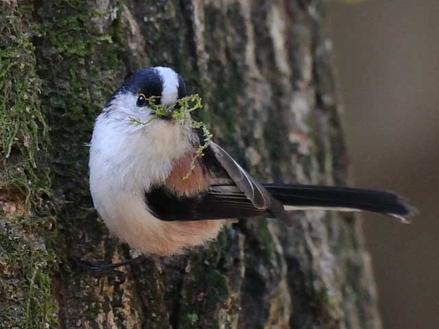 やはりここでもエナガの巣作りの準備が始まっているようで、苔を集めて咥えています。