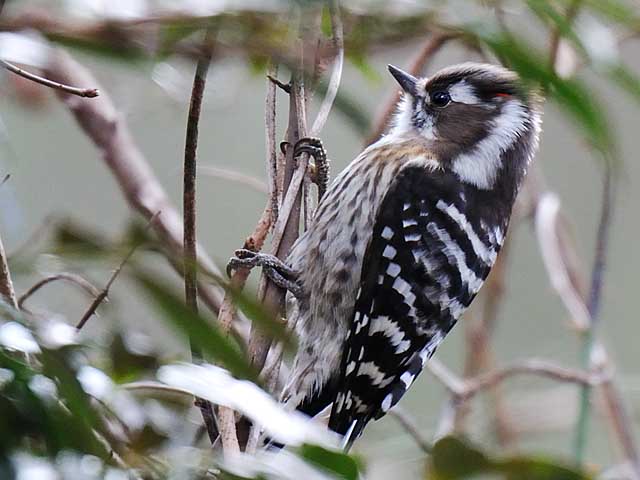 赤い小さな羽根飾りを着けたコゲラの雄です。