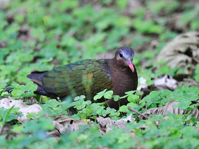 森の下草の中で食事中のキンバトです。