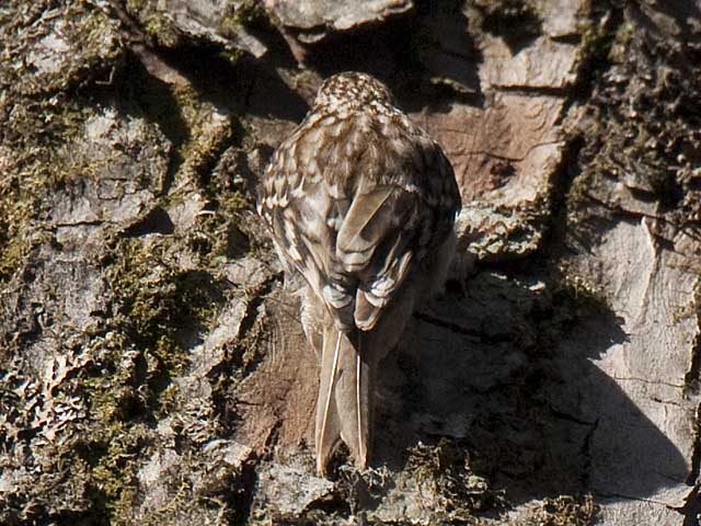 この写真では幹の皮がはげているところにいるのでわかりやすいのですが、多くの場合、木の幹で餌を探して登り折りしていても保護色でどこにいるのか見つけ難い鳥です。