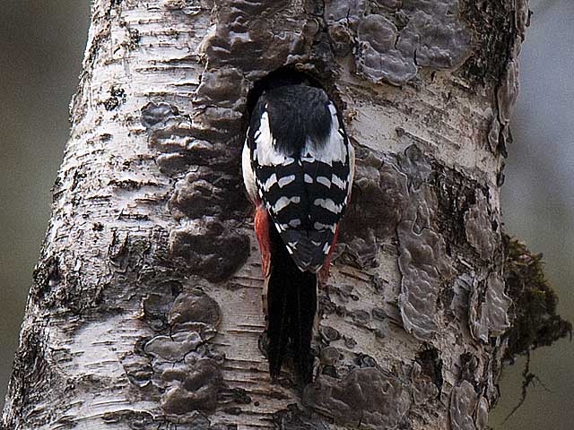アカゲラの雌が白樺の巣穴に出入りをしていました。