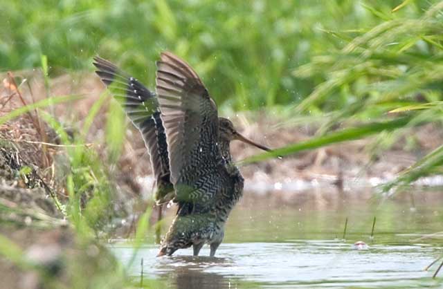 タシギでは翼を広げたときに目立つ次列風切羽の先端の白線が目立たず、かつ、下雨覆も白くありません。