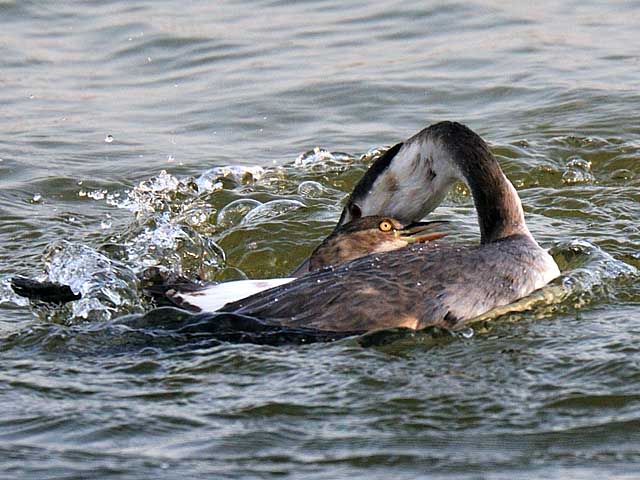 体格に勝るカンムリカイツブリは何度かカイツブリの頭を水のなかに押し込むのですが潜水ならどちらもお手の物と見えて闘志はくじけないから見事なものです。