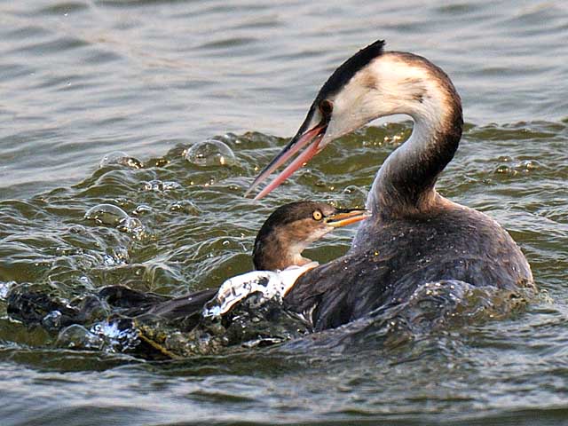 体格に勝るカンムリカイツブリは何度かカイツブリの頭を水のなかに押し込むのですが潜水ならどちらもお手の物と見えて闘志はくじけないから見事なものです。