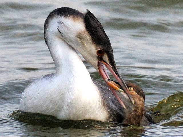 体格に勝るカンムリカイツブリは何度かカイツブリの頭を水のなかに押し込むのですが潜水ならどちらもお手の物と見えて闘志はくじけないから見事なものです。
