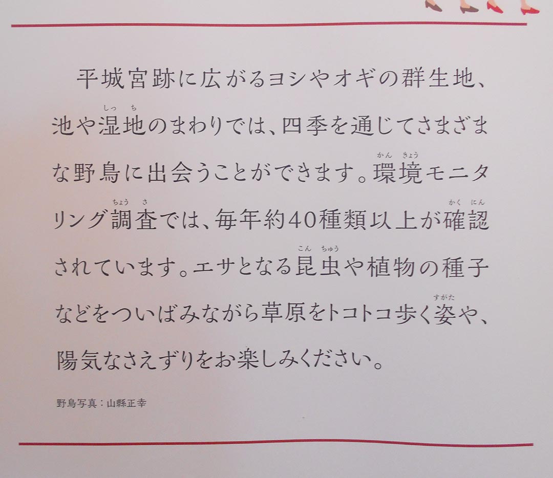 平城宮跡歴史公園が開園しました。公園内の「いざない館」に「平城宮跡の野鳥」というパネルが常設で展示されています。そのパネルに父(正幸)の写真を使っていただきました。