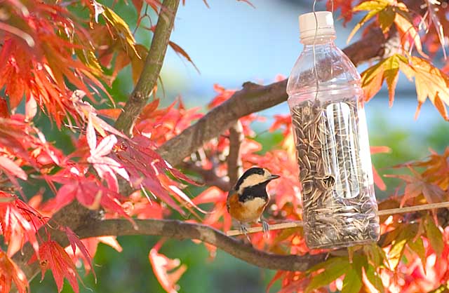 最近はスズメが集まり出してすぐにヒマワリの種を下に掻き落とすので、今年もまた、ペットボトルフィーダーに登場してもらいました。