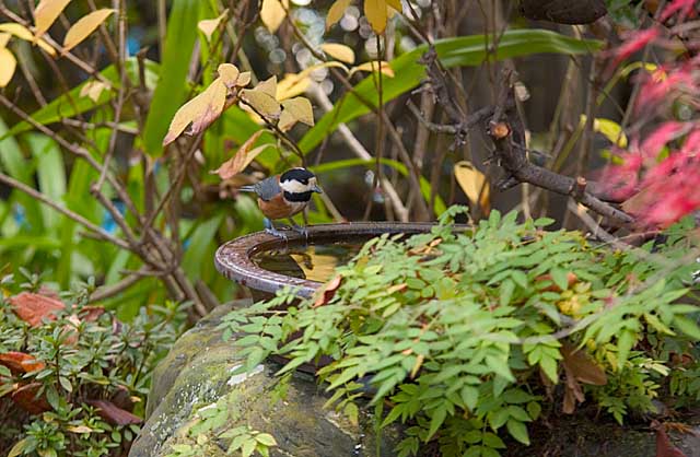 バードバスの周りもレンギョウやモミジの紅葉が始まり、こちらもお客さんでにぎわっています。
