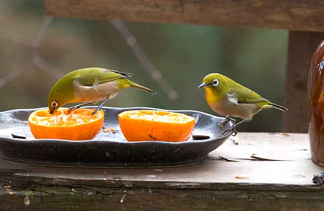 2005.2.1 メジロ 最近、メジロは二組がやって来ています。 一組のほうは雄が食べている間、雌は必ずモミジで待機していて、雄が食べ終わってから食べているのですが、このカップルはいつも二人でやって来て, 時には一つの蜜柑を仲良く食べてゆきます。 |