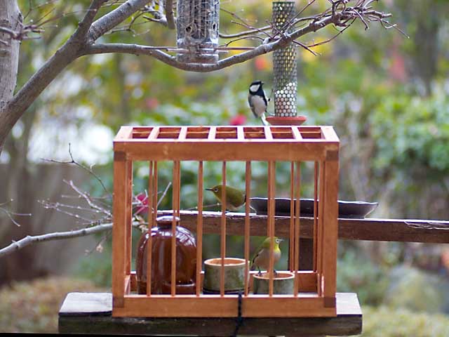 二日ほど掛けて製作して、今朝、置いてやりますと、メジロは一瞬の躊躇もなく、格子の間から飛び込み、柿を食べたりジュースを飲んでいます。