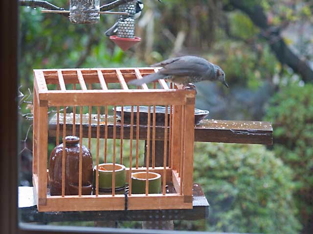 昨日セットしたケージにヒヨドリがやってきてなんとか中の柿やジュースを狙っていましたが諦めて帰って行きました。