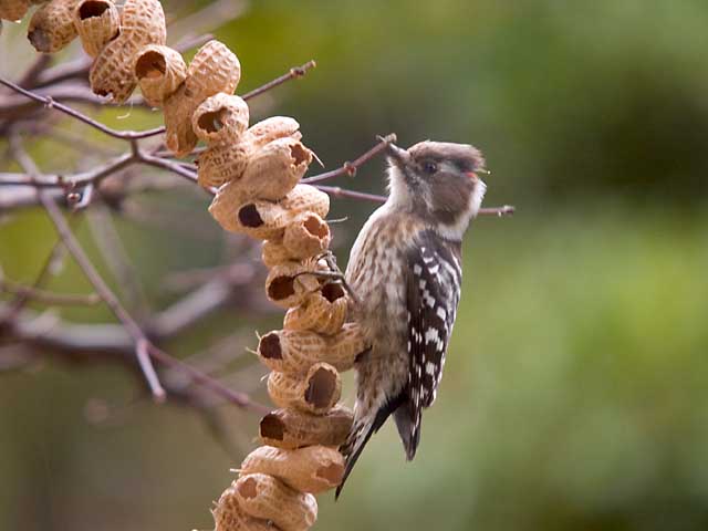 このところ、毎日、サクラややウメに来ているコゲラが始めてピーナッツリースに来てくれました。