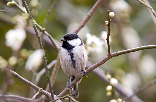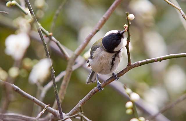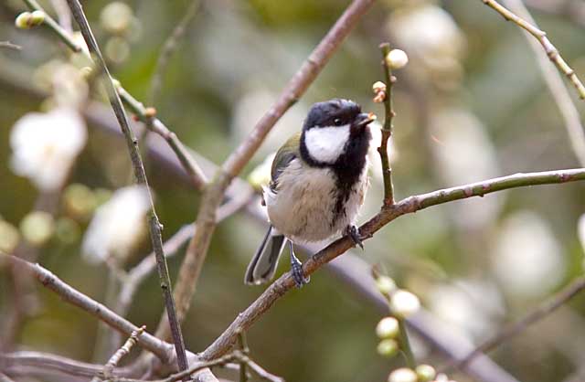 シジュウカラや、ヤマガラ、スズメ等も時々、梅やアンズ等の蕾や花をつまむことがあります。
