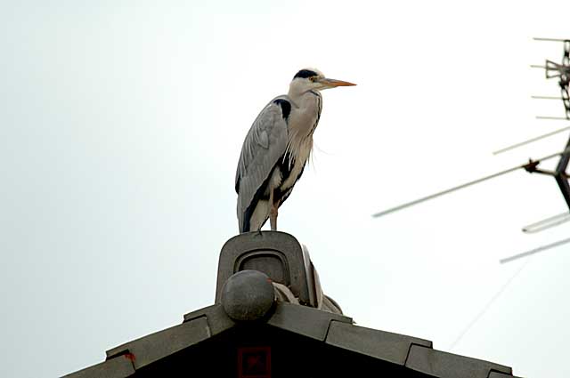 カメラを向けるとすぐに飛び立ちご近所の屋根に止まりました。