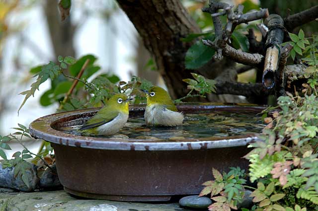 メジロのカップルはよく一緒に入浴します。