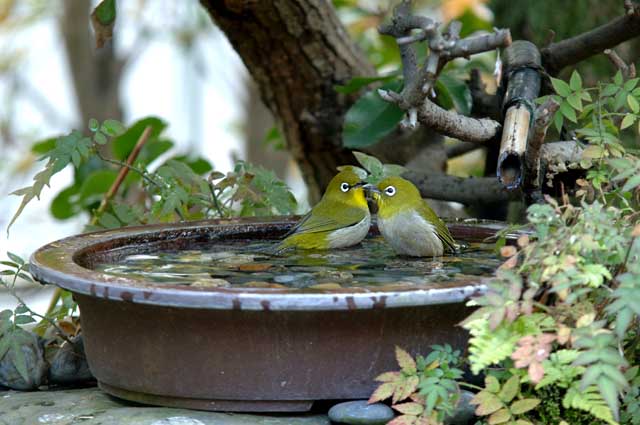 メジロのカップルが、仲が良いと言うよりは、メジロは他の鳥のことをあまり気にしないで行動するということのようで、シジュウカラやヤマガラ、スズメがいても、比較的平気で飛び込んで入浴します。