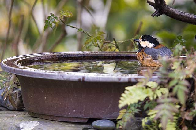 ヤマガラは水浴に来て、少し水を浴びた後に、冷たい水の中で全く動かずに5分以上じっとしていることがあります。