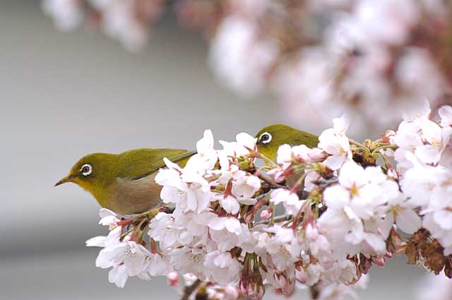 八分咲きの桜にやってきたメジロのカップルです。