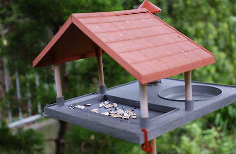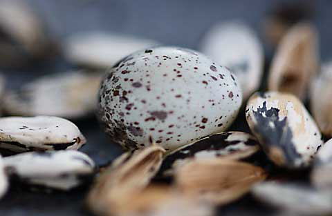 2003.05.25 餌台上の卵発見 なんと、本日の午後に餌台上に卵を発見しました。 餌台上には白く変色した古いヒマワリの種が残っており、種に混じって中央に卵がありました。 ヒマワリの古い種の模様は卵を思わせないではないのですが、どうしてこんなところに産んだのか不思議です。産卵時期は5月中旬以降としかわかりません。 |
