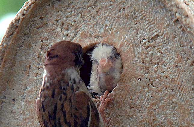 三日ほどまえに、初めてこの写真を掲載したおりに、アルビノと間違えてしまいましたが、これは雛が後ろを向いて肛門を親鳥に向けて脱糞する寸前の写真でした。