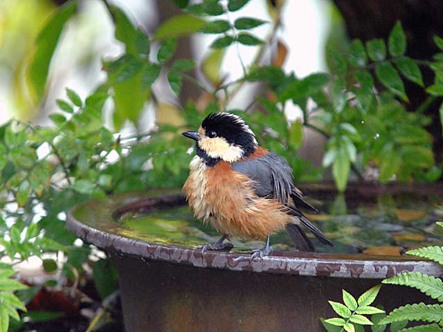 結局ヤマガラが水浴を終えるまでジョウビタキは木の枝で待っていて、この直後に水浴を始めました。