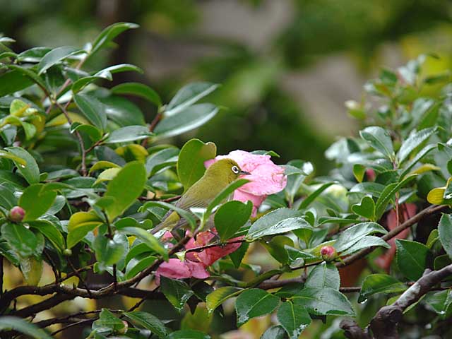 お風呂あがりは咲き始めたばかりのサザンカでおやつです。
