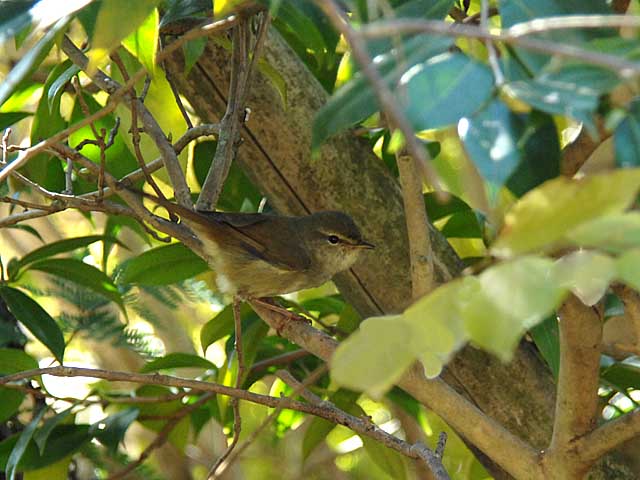 お風呂あがりに木犀の枝のなかで羽繕いをしているウグイスです。