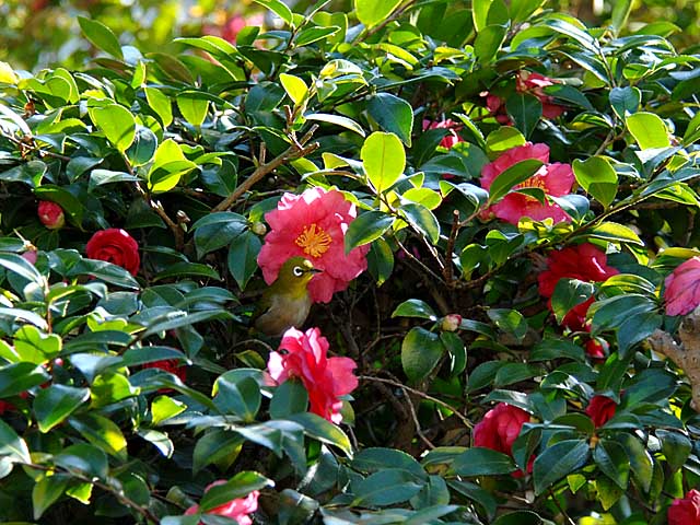 シシガシラが満開でメジロが蜜や花粉を求めてやって来ます。