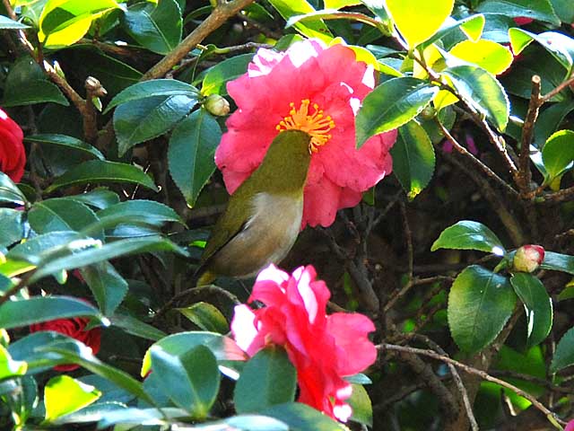 シシガシラが満開でメジロが蜜や花粉を求めてやって来ます。