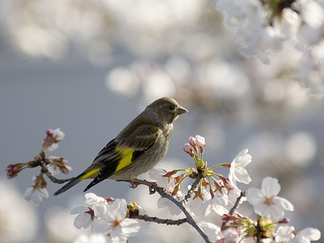 桜に来たカワラヒワ