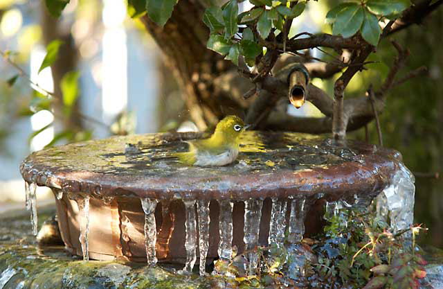 朝一番に氷を一部割ってやると早速一番のりでメジロが水浴をはじめました。