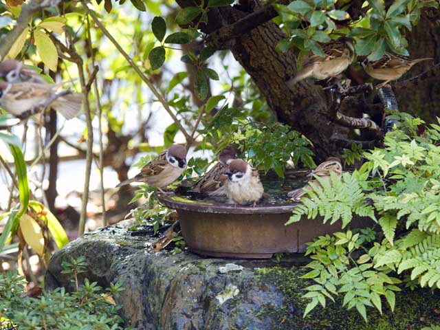 バードバスのスズメたち